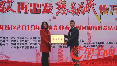 金羊网讯记者符畅、实习生任亚文、通讯员廖培金报道:1月19日,广州市海珠区2019年爱心企业春节慰问困难群众活动在海珠丽影B区广场举行,现场爱心单位和人士共捐赠物资共162.1万元。据悉,慰问活动从即日起将持续到春节,海珠区低保对象、低收入困难家庭等将在春节前喜获一份爱心大礼包。